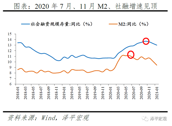 2020年11月社融增速见顶,广义流动性拐点出现,2021年1月社融、M2增速继续回落,拐点进一步确认。量上来看,自2020年5月货币政策回归正常化以来,M2、社融增速分别于7月、11月出现拐点,2021年1月,社融增速已从10月高位下降0.7个百分点至13.0%,M2从6月高位下降1.7个百分点至9.4%。价上来看,10年期国债收益率自5月以来持续抬升,已回升至2020年初水平。