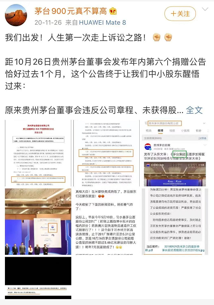 之后,“茅台900元真不算高”联合230多位股东集体诉讼贵州茅台,称茅台不开股东大会大额捐赠行为侵犯中小投资者利益。并且,聘请了律师准备集体诉讼。媒体对此事进行了广泛报道。