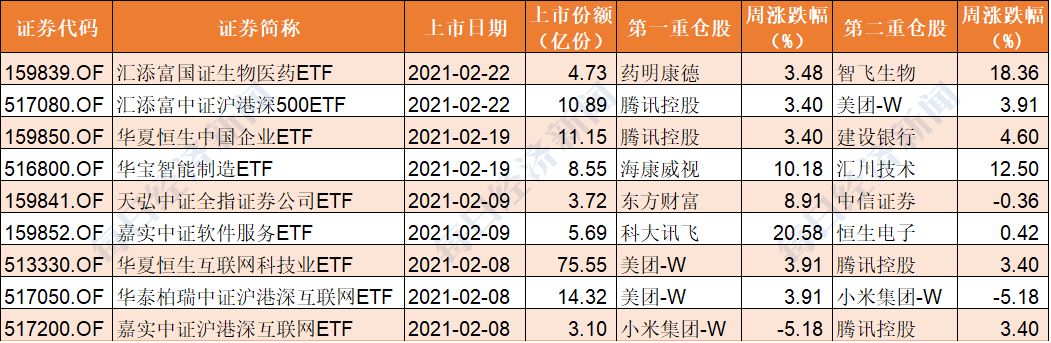 节后已有4只ETF披露上市,其中1只为智能制造相关ETF,头号重仓股为海康威视,1只为生物医药相关ETF,头号重仓股为药名康德,另外2只与港股相关的ETF头号重仓股均为腾讯控股。