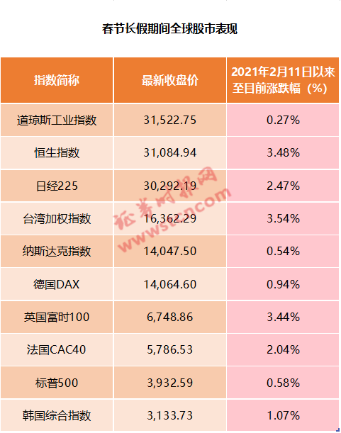 内地春节长假期间,全球股市仍在交易,主要股指均大幅上涨。