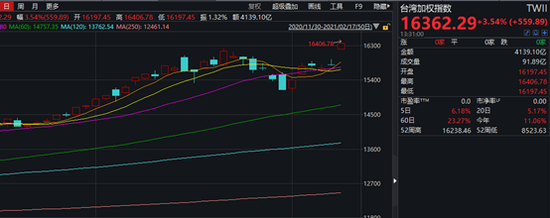 随着全球股市大涨,台湾加权指数今天也强力补涨,展现牛市气势,全天暴涨近600点,涨幅高达3.54%,该指数盘中一度触及16406.78点,创下历史新高。