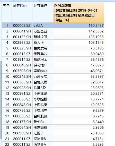 表格显示,排名第一的就是万科A,累计涨幅为160.8%。此外,涨幅超过100%的股票有4只,其他地产股的表现并不强势。