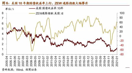 当前美国十年期国债收益率回升至1.3%,已经恢复至疫情前的水平。长债利率主要受短期利率、通胀预期和时间风险溢价影响。近期通胀预期的升温是10年期国债利率走高的重要推动因素。截至1月份ZEW美国通胀指数增长至62.2,接近2018年的高点水平。后续随着油价的上行,市场对大宗商品涨价的预期较为一致,预计带来通胀的继续上行,10年期国债收益率预计仍有上行空间。