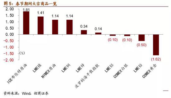 【大宗商品:价格多数上涨】需求回升预期下,大宗商品价格多数上涨。春节期间Brent原油和美国轻质原油(WTI)均继续上行突破60美元/桶,价格均恢复至疫情前水平。需求回升是刺激油价上行的重要原因。除了原油价格大涨外,春节期间全球多数大宗商品价格上涨。