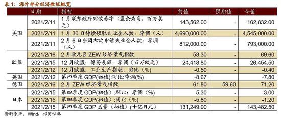 近期公布的部分经济数据均有明显改善。1月份美国联邦政府财政赤字进一步扩大至162832百万美元(前值143562百万美元);1月30日持续领取失业金人数降至4545000人(前值4690000人);2月6日当周初次申请失业金人数793000人,较前值812000人有所下降。2月欧元区ZEW经济景气指数较大回升至69.6(前值58.3);12月欧盟贸易差额季调值为26454.5百万欧元,较前值24418.8百万欧元有所回升。2020年四季度日本GDP同比降幅收窄至-1.2%(前值-5.8%),环比增长3.0%(前值5.3%)。
