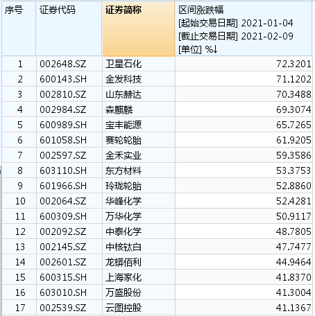 基础化工的龙头股连续走强。卫星石化(002648.SZ)、金发科技(600143.SH)、万华化学(600309.SH)、恒力石化(600346.SH)股价均在年内刷新历史高点。