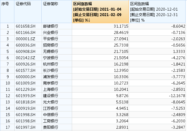 今年1月以来,银行板块先声夺人。年涨幅超10%的银行股有11家,板块内有六成个股录得上涨。其中平安银行(000001.SZ)、招商银行(600036.SH)、无锡银行(600908.SH)等6只个股均张超20%。对比2020年12月单月,仅4家银行录得上涨。