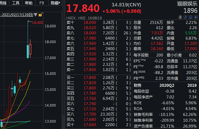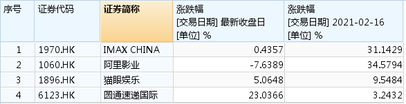在票房大卖的利好刺激下,港股影视板块大幅上涨。2月16日,IMAX中国(01970.HK)、阿里影业(01060.HK)分别大涨31.14%、34.58%,猫眼娱乐(01896.HK)涨超9%。