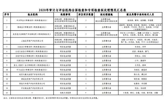 证监会2月19日通报2020年审计与评估机构检查处理情况时指出,根据本次全面检查及专项检查情况,拟对8家次审计机构及28人次注册会计师、6家次评估机构及27人次资产评估师、6名违法买卖股票的执业人员采取出具警示函的行政监管措施并记入诚信档案,同时对部分涉嫌违法违规的问题线索移交稽查处理。各证监局根据检查情况对105家次审计机构及225人次注册会计师、22家次评估机构及47人次资产评估师分别采取了出具警示函、监管谈话等行政监管措施并记入诚信档案。