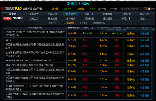 2020年9月28日登陆创业板的爱美客,上市至今股价上涨了255%,随着年报的公布,爱美客的前十大流通股东也随之公布,其中包括牛散葛卫东;公募基金银华富裕主题、广发双擎升级A、广发小盘成长C、华泰柏瑞品质优选C、汇添富中盘价值精选A,另外也包括QFII摩根士丹利,还有资管产品、平安人寿资金和阳光私募上海珏朔。爱美客在上市后的第二个月,被外资、公募、险资、牛散等共同增持。