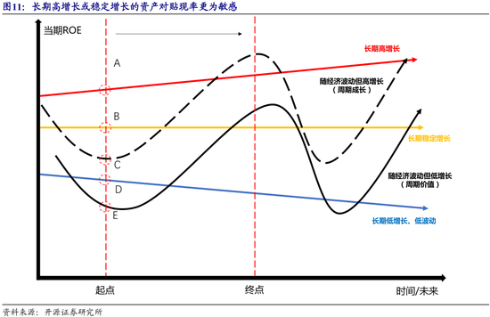贴现率其实影响的是估值模型中对于不同时期的现金流折现价值,即赋予长短端盈利以不同的权重;而如果我们把不同行业之间的盈利增长大致分为与经济波动强相关、与经济波动弱相关或不相关,同时进一步地在上述两个分类中可以继续将资产分为高增长、低增长或稳定增长,则我们可以对不同的宏观环境对估值模型假设造成的冲击进行一一分析。
