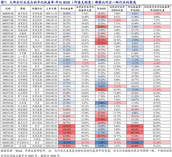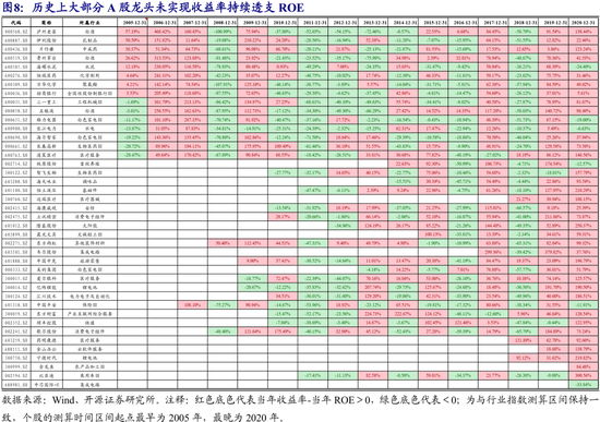 第四,仅从历史上当年收益率-当年ROE的视角来看,大部分龙头也很难实现收益率持续透支ROE。2021之后的投资世界是否和历史不一样,不得而知。