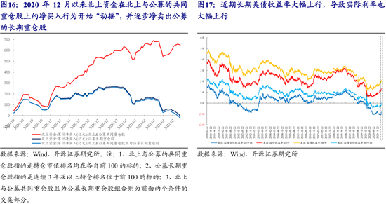 同时我们也观察到2020年12月以来北上资金在北上与公募的共同重仓股上的净买入行为开始“动摇”,逐步净卖出公募的长期重仓股,于此同时美国的实际利率上行速度和幅度均超出市场预期,公募持有的核心资产特别是长期持有的核心资产的性价比正在下降。