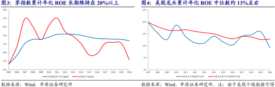 具体到个股层面来看,我们发现龙头之间的差异化也十分明显。以A股的茅指数成分股为研究对象,我们可以得到以下几点关于A股龙头收益率与ROE之间的关系: