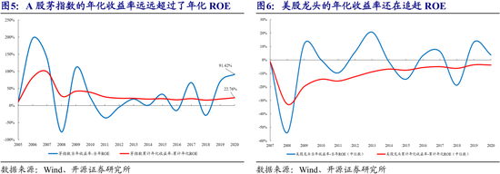 如果我们从ROE和收益率视角出发,会发现中美两个市场中的龙头的定价逻辑截然不同:美股龙头过去长期稳定的高ROE被市场逐步认可,通过二级市场买入、公司回购等因素,逐步让长期收益率追赶上长期ROE,一二级股东的收益率正在逐步被拉平;A股龙头的核心资产地位被A股投资者不断认可,长期的美好愿景因为“优质资产的稀缺”等逻辑被提前计入资产价格,特别在机构化、北上资金涌入与居民入市等结构性因素下,配合宽松的流动性环境,长期的价值被极大发现。两地抱团龙头,都有其内在合理性,但逻辑不同显而易见:一个是对过去的纠偏,一个是对未来的提前兑现。
