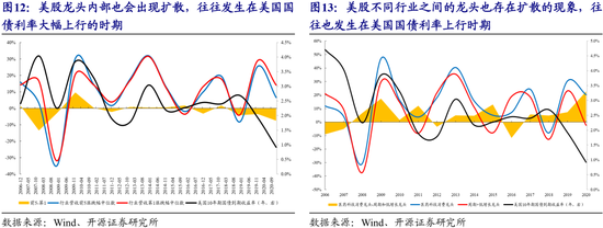 我们通过历史回测发现,历史上美股的龙头扩散也基本上遵循了上述两种路径:一种是龙头内部的扩散,即绝对的一线龙头向二三线龙头扩散;第二种是不同类别资产之间的龙头扩散,比如从科技消费转向周期。而上述两种扩散往往发生在美国国债利率大幅上行的时期。