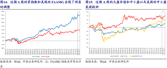 近期我们也能够观察到的迹象是A股的茅指数以及美股以FAAMG为代表的科技龙头出现了明显的调整,而A股的大盘价值以及中小盘股和美股的中小盘股正在崛起。用长期的抱团趋势去解释短期的收益率与ROE之间背离的合理性明显并不合理,投资者应该充分重视全球经济复苏带来的再通胀的两面性:一方面带给第二类资产的高ROE弹性;另一方面又带来对第一类资产更为不利的贴现率上行风险。