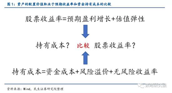 资产的配置价值就取决于资产预期收益率与资金持有成本的比较,资金的持有成本越低,越能接受长期年化复合收益越低的资产。拆分来看,资金的持有成本由三部分组成:资金本身的成本、风险溢价、机会成本(无风险收益率)。