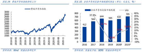 全球半导体景气度持续向上,随着疫情冲击的消退,下游需求也将快速释放。2020全球半导体资本开支开始恢复增长,根据IC Insights,VLSI,预计2020年代工Capex同比大幅增长 38%,目前存储投资已经开始全面恢复,预计2021年存储Capex同比增长约5%。另外,2021年全球半导体设备市场也有望创新高点,SEMI预计2020年全年设备市场恢复到2018年水平,2021年存储支出恢复、代工厂商扩产将拉动设备需求至705亿元新高,同比增长11.6%。