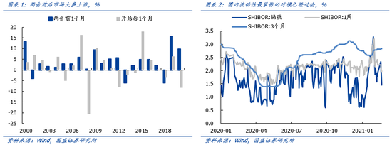 2、跨年行继续,将持续至四月中上旬。1)全球经济持续复苏、疫情加速改善。英国、日本四季度GDP增速高于预期,显示全球经济正加速修复。与此同时,全球疫苗加速接种、疫情持续改善,也进一步强化后续主要经济体重新开放、全球经济共振复苏的乐观预期;2)全球货币政策维持宽松,财政刺激也持续加码。此前美国国债利率大幅上行一度引发市场担忧。但当地时间2月17日发布的美联储议息会议纪要显示,当前美国经济状况与美联储的长期目标“相去甚远”,并反复强调将维持高度宽松的政策,缓解市场对于货币政策收紧的担忧。与此同时,2月19日美国众议院预算委员会公布了1.9万亿美元的纾困法案,并有望于3月中旬通过。3)国内流动性最紧张的时候已经过去。春节流动性需求高峰过后,市场流动性正持续改善。当前7天shibor利率已由1月底的3%以上大幅回落至2%以下。4)3月5日两会召开在即,带动国内市场政策预期升温。参考历史经验,两会前市场大概率上涨,近20年平均涨幅为3.65%。两会开始后的一个月内也多数上涨,近20年平均涨幅为1.61%。