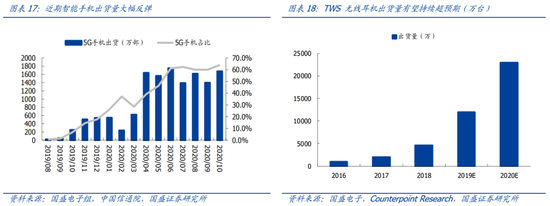 消费电子方面则渗透率不断加速,创新不止,延续高增。智能手机方面,国内5G渗透率不断加速,2020年10月国内手机市场总体出货量2615.3万部,同比下降27.3%,降幅环比收窄;然而10月中国5G手机出货量1676万部,占出货量64.1%,再创新高,10月上市5G新机型16款,占同期手机上市新机型数量的57.1%。TWS无线耳机增长势头不减,根据CounterpointResearch统计,TWS无线耳机的市场渗透率仅为15%, 2020年TWS无线耳机的出货量将达到2.3亿副,相对于2019年翻倍增长,随着蓝牙技术的升级、3.5mm耳机孔的取消以及体验感的提升,未来TWS耳机市场前景广阔。