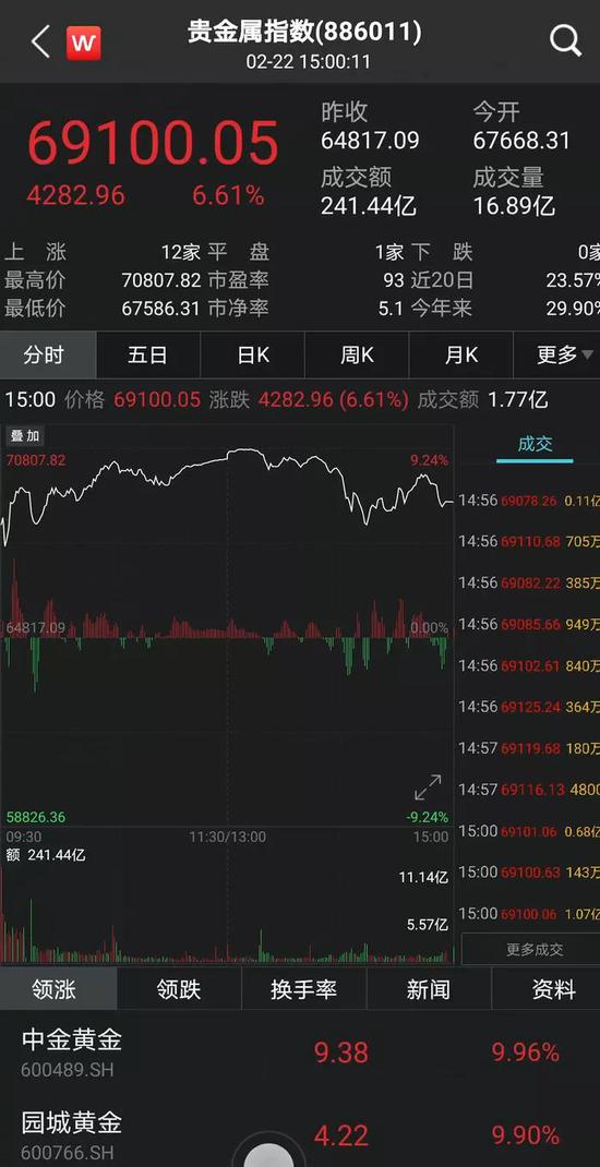 中国黄金收涨9.96%,盘中一度封涨停板的紫金矿业收涨7.26%,成交额突破百亿元,连续两个交易日突破百亿。