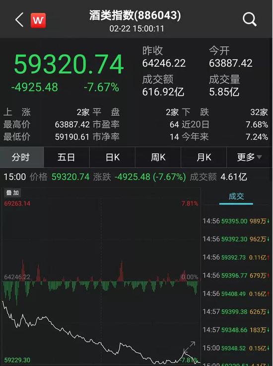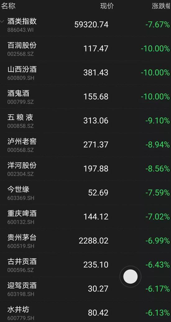 酒类指数暴跌7.67%。其中,山西汾酒、酒鬼酒、百润股份跌停。五粮液跌超9%,泸州老窖、洋河股份跌幅超8%。
