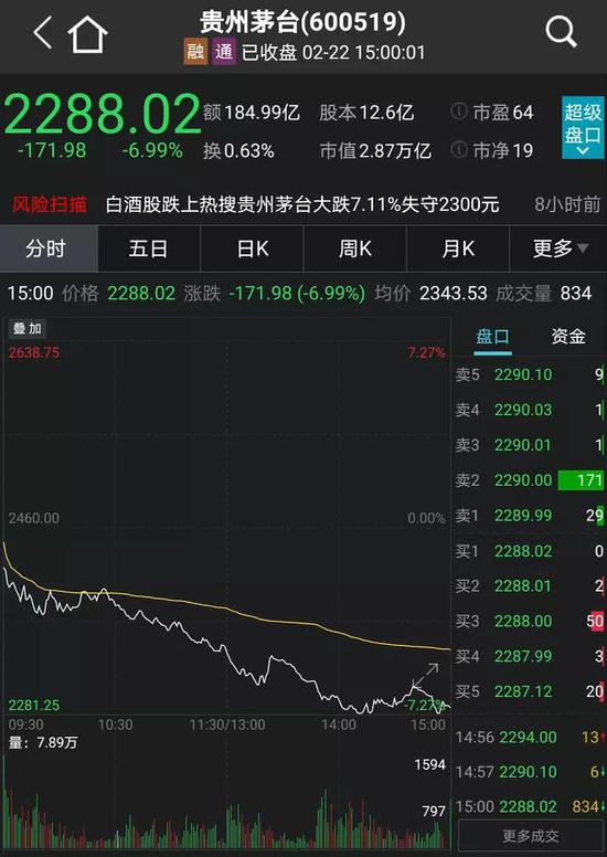 今天,贵州茅台直接跌近7%,股价跌破2300元关口。值得注意的是,牛年以来三个交易日,贵州茅台三日累计下跌近13%,连续跌破2500、2400、2300元三道关口,市值缩水近4200亿元,跌破3万亿。