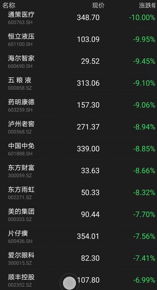 其中,通策医疗率封住跌停板,恒立液压接近跌停。药明康德跌超9%,中国中免跌近9%,东方财富跌8.66%,美的集团、爱尔眼科跌超7%,顺丰控股也跌近7%……