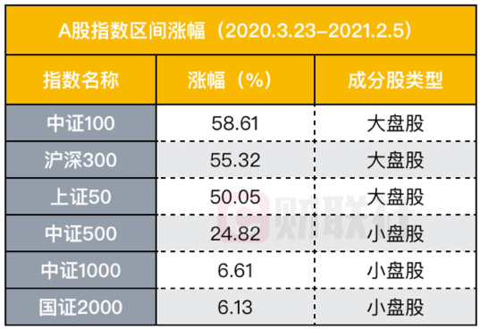 从3月低点至2月5日收盘,纳斯达克指数上涨101.97%,远高于标普500和道指涨幅,在大盘股指数中遥遥领先,但涨幅依然低于罗素2000和标普小盘600指数。