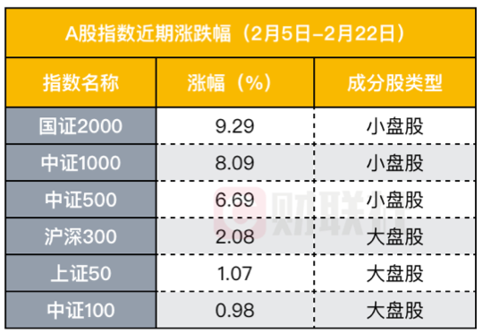财联社曾在2月9日发表报道,彼时,以中证1000、国证2000为代表的小盘股指数刚刚经历近半年的震荡下跌。