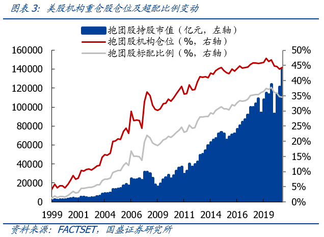 美股机构抱团不断加深,机构重仓股长期超配。若以机构持股占比高于80%的美股作为机构重仓股,在过去20年中,机构对美股重仓股的持仓由不足10%增加至近50%,且超配比例不断扩大,1999年超配5个点、2020年超配达到12个点。