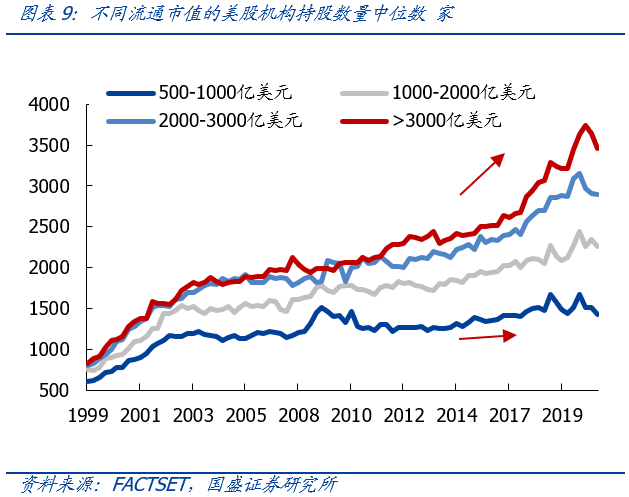 进一步按流通市值分组,龙头的机构持股数量占优。将美股按流通市值分组,流通市值大于3000亿美元、2000-3000亿美元、1000-2000亿美元与500-1000亿美元之间的持股机构数量差距在过去10年中不断扩大,市值越大,持股机构越集中,机构“以大为美”的选股偏好进一步强化。