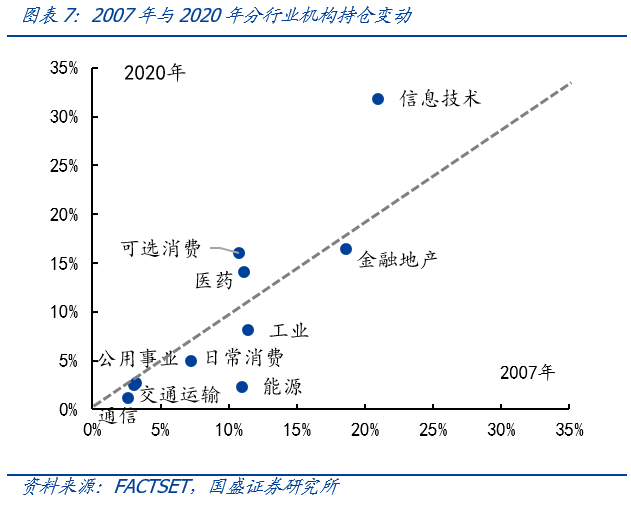 2、美股机构抱团也会阶段性向周期行业松动,但长期来看始终抱团消费与成长,尤其是2007年以来坚守信息技术与可选消费。