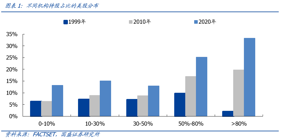 美股机构抱团是常态,机构话语权不断增强。随着美股机构发展壮大,机构持股占比在过去20年中大幅增长,当前机构持股市值占全市场流通市值的比重也已高达70%,成为美股市场的主导力量。截至2020年,机构持股比例在80%以上的个股占33%,这一比例在1999年仅为2%;持股比例位于50~80%之间的个股占比25%,这一比例在1999年仅为10%。