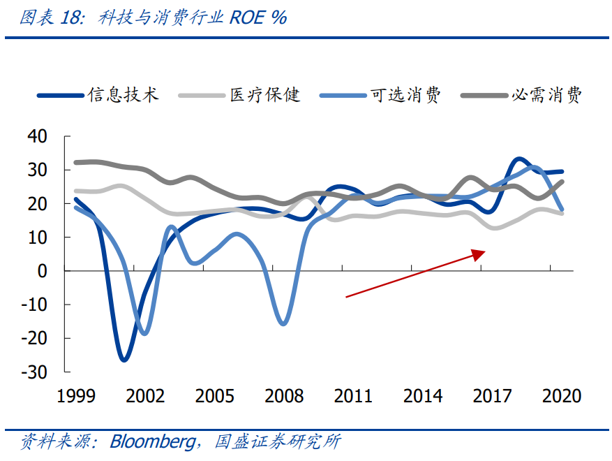 5、对盈利确定性和稳定性的追求是美股抱团的根本驱动。科技和消费长期优质的基本面表现长期占优;近40年美股龙头保持更高的ROE,提供更加长期的稳定回报,成为机构的抱团首选。