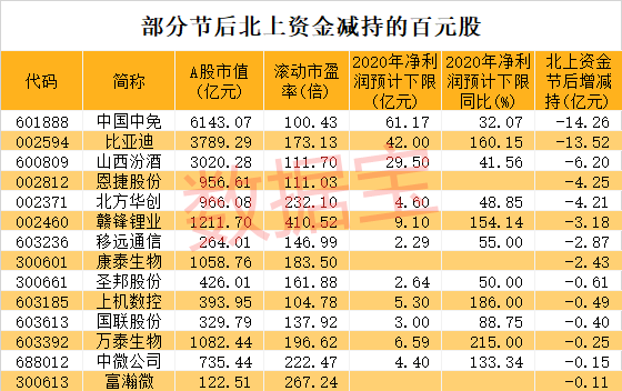 从北上资金动态来看,部分高估值的百元股已遭到北上资金撤离。数据显示,按照区间成交均价粗略计算,上述55只市盈率百倍以上的百元股中,春节以来北上资金减持超过亿元的共有8股,分别是中国中免、比亚迪、山西汾酒、恩捷股份、北方华创、赣锋锂业、移远通信、康泰生物等。中国中免遭北上资金减持规模最高,达到14.26亿元;其次是比亚迪,减持资金达到13.52亿元。