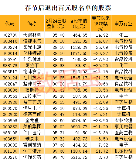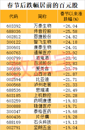 与节前炙手可热的火爆情形不同,节后以百元股为首的高价股表现平淡,并且成为拖累大盘指数的主要力量。统计显示,最新收盘价百元以上的股票春节后平均跌幅为8.85%,跑输同期沪指6.36个百分点。近八成百元股春节以来股价下跌,14股节后至今累计跌幅超过20%,包括万泰生物、传音控股、恩捷股份、智飞生物、康泰生物等。