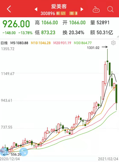 爱美客在春节后第一个交易日创下历史高点后回落,目前A股市值回落至1113亿元。2020年年报中,超级牛散葛卫东现身爱美客十大流动股东名单之中,持仓市值2.85亿元。假设其持仓未变动的情况下,在爱美客历史高点的时刻,葛卫东持仓最高达到5.78亿元,近日大幅调整之后,股价较历史高点回撤30%以上,粗略估算,节后短短5个交易日内,葛卫东持仓市值减少约1.76亿元。