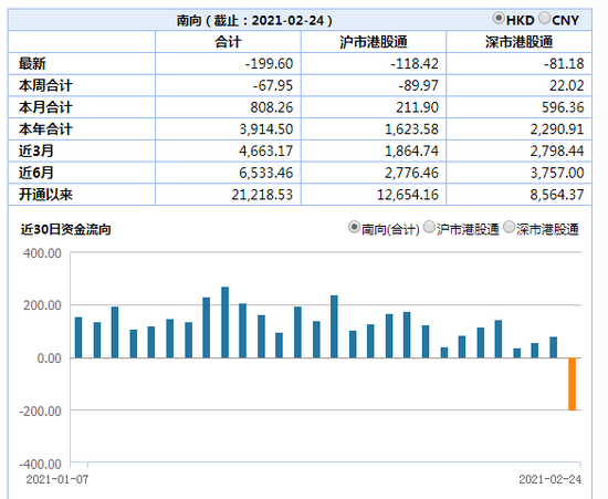 南向资金今日同样调转方向,大幅净卖出199.6亿港元,为今年以来首次出现净卖出的情况。其中沪市港股通净卖出118.42亿港元,深市港股通净卖出81.18亿港元。