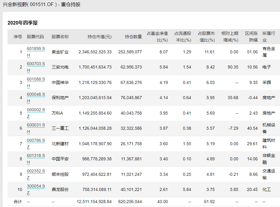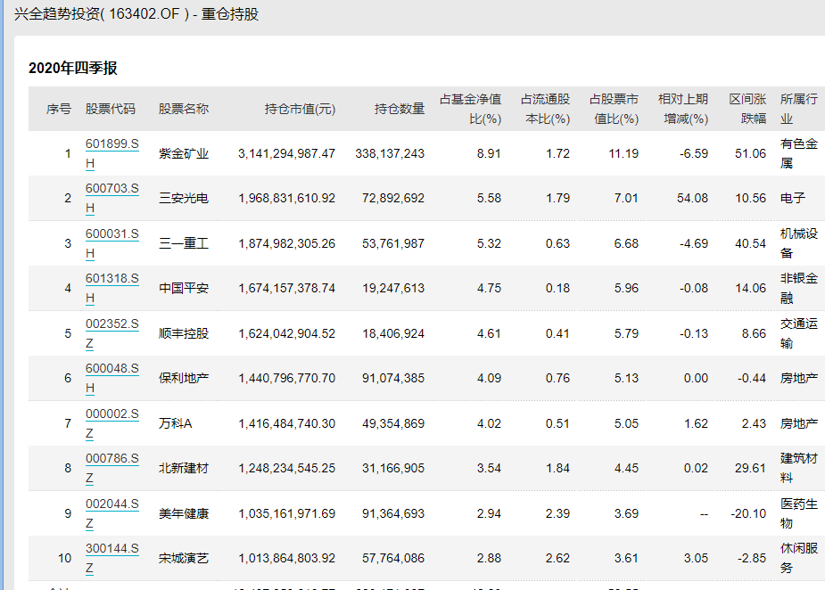 2020年四季度末,兴全趋势投资的前十大重仓股为紫金矿业、三安光电、三一重工、中国平安、顺丰控股、保利地产、万科A、北新建材、美年健康、宋城演艺,其中很多都是去年的热门股,涨得很凶,但却都不是白酒股。