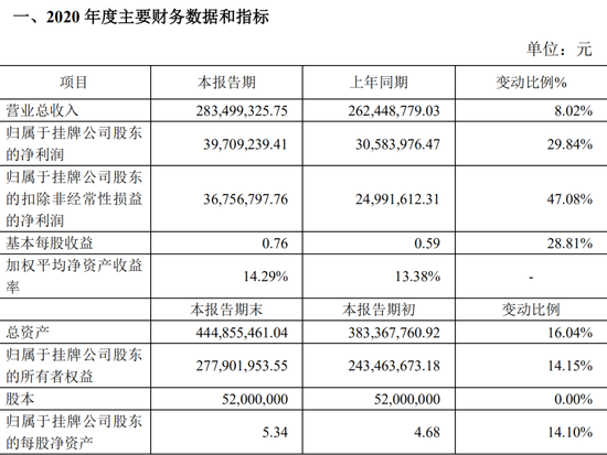 创新型生物医药企业诺思兰德也公告,预计2020年实现营业收入4144万元,同比增长471.44%。截至2020年末,预计公司总资产3.55亿元,同比增长132.67%;归属于挂牌公司股东所有者权益2.75亿元,同比增长277.24%。诺思兰德尚未盈利,其2020年归属于挂牌公司股东的净利润为 -2798万元,是37家精选层公司中唯一一家净利润为负的公司。其表示,营业总收入较去年同期增长原因是本年取得技术转让收入较多。而总资产、归属于挂牌公司股东的所有者权益较去年大幅增长则是因为公司11月份在精选层挂牌,募集资金到账使公司的货币资金、股本和资本公积较去年同期金额增加。