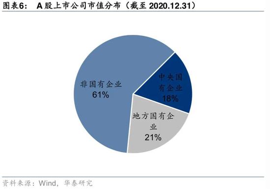 国企是A股的重要组成部分,根据wind数据,上市公司家数国企占28%,总市值占39%。截至2020年12月31日,A股共计有非金融上市公司3963家,其中中央国有企业总计368家(总市值11.43万亿),地方国有企业732家(总市值13.53万亿),剩下的非国企(包括公众企业、集体企业、民营企业等)2863家(总市值38.96万亿),我们以上述中央国有企业、地方国有企业、非国企三组公司为样本,分析当前国企改革的最新变化。