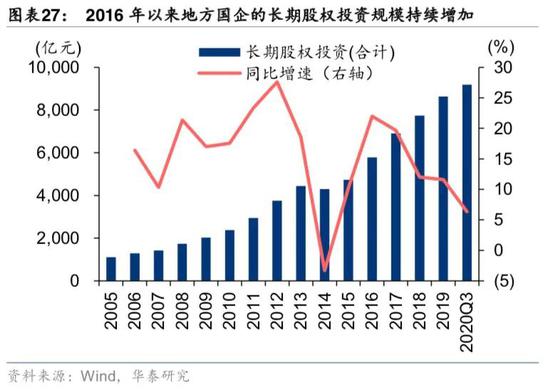 长期股权投资方面,地方国企对长期股权的投资持续增加。2005-2013,地方国有企业长期股权投资一直以相对较高的增速持续增长;经历2014年的短暂回落后,2015-2016,长期股权投资增速有所有所回升,我们认为这可能与地方国企改革进入提速阶段有关;2017-2020,地方国企的长期股权投资规模继续一直保持增长,但增速持续回落,与央企相比,地方国企对于长期股权投资的力度明显较弱。