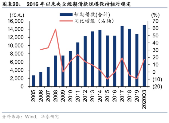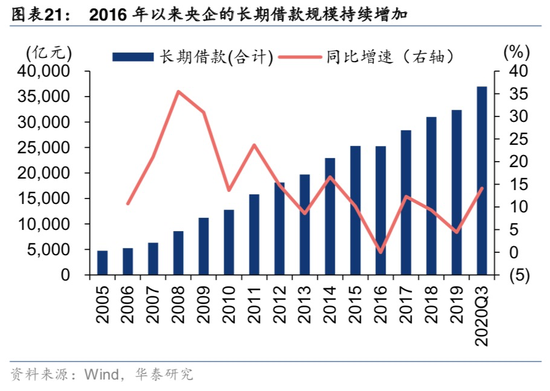 从负债结构来看,2017年以来央企的短期借款规模基本保持稳定,而长期借款规模稳定增长。借款同比增速方面,2005-2013,在我国经济相对较高速增长背景下,央企的短期及长期借款增速均相对较高,表明央企主动并积极扩张。2014-2015,随着经济下行压力显现,借款同比增速显著回落至;2016-2019在供给侧改革“三降一去一补”框架的驱动下,央企主动去产能,长期借款同比增速处于相对平稳的低增长状态。借款总规模方面,2016年以来,央企的长期借款体量约为短期借款的两倍左右,相比于短期借款,长期借款循环使用时间长,更加稳定,2018-2019,长期借款增速总体高于短期借款,表明央企的负债结构正有所改善。2020年,受疫情影响,在央行宽信用政策的持续发力下,央企短/长期借款规模均明显增加。