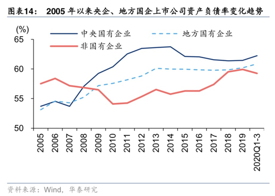 国企的整体负债率上升后维持相对稳定,而非国企显著上升。从资产负债率来看,2005-2012,央企和地方国企的总体负债率呈现不断上升的态势,而非国企则不断下降,反映出国企在这个阶段处于不断加杠杆过程,而非国企则是不断去杠杆的过程。2013-2019,央企的资产负债率有所下降,并保持相对稳定,地方国企维持稳定,而非国企杠杆率显著上升。从资产结构质量来看,2005-2009,地方国企和非国企的流动比率呈现不断上升的趋势,反应出资产结构在改善;2010-2019,非国企的流动比率出现逐步下降,反映出资产结构有所恶化,而央企和地方国企流动比率则不断提升,资产质量改善明显。