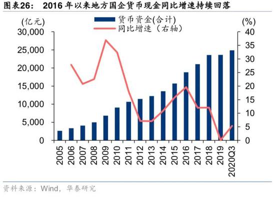 从现金流角度来看,2005-2010,地方国企的经营活动、筹资活动、投资活动产生的现金流量净额都基本处于逐渐增长的阶段;2011-2017,地方国企经营性净现金流继续稳定增长,但筹资现金流开始回落,投资现金流绝对值则继续增加;2018-2019,筹资现金流继续下滑,并下滑至负值,而投资现金流绝对值继续增长,表明这个阶段的地方国企债务压力或显著增加,为降低风险或主动开始偿还债务;2020年,疫情影响下,前三季度经营性现金流总体回落,筹资现金流回升,投资现金流绝对值也减小,或表明地方国企增加现金储备并减少投资支出。总体来看,与央企相比,2011-2018期间,地方国企的筹资现金流回落较慢,可能表明地方国企的承担逆周期调节的属性更强。
