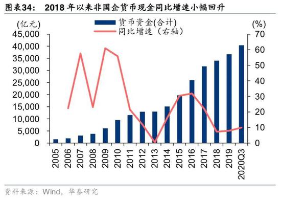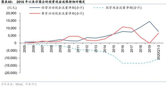 从现金流角度来看,2005-2016,非国企的经营活动、筹资活动、投资活动产生的现金流量净额的规模都处于稳定增长的阶段,期间2012-2014,筹资现金流出现回落,或反映出非国企市场化的去产能;2017-2019,在金融去杠杆叠加中美贸易摩擦的外部压力下,虽然非国企的经营活动现金流净额继续回升,但投资活动(绝对值)、筹资活动产生的现金流量都有所下降,反映出企业筹资能力减弱、投资支出意愿减弱;2020年前三季度,在疫情影响下,非国企经营活动现金流有所下降,但宽信用政策使得筹资现金流回升,而投资现金流(绝对值)则有所小幅下降,反映出疫情下非国企对投资依然相对谨慎。