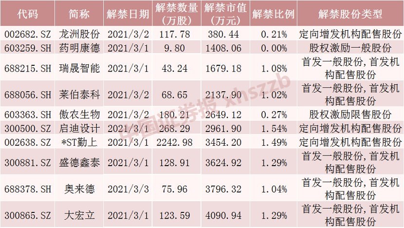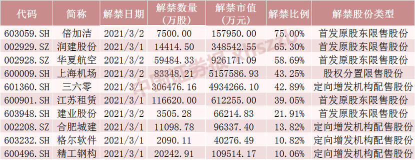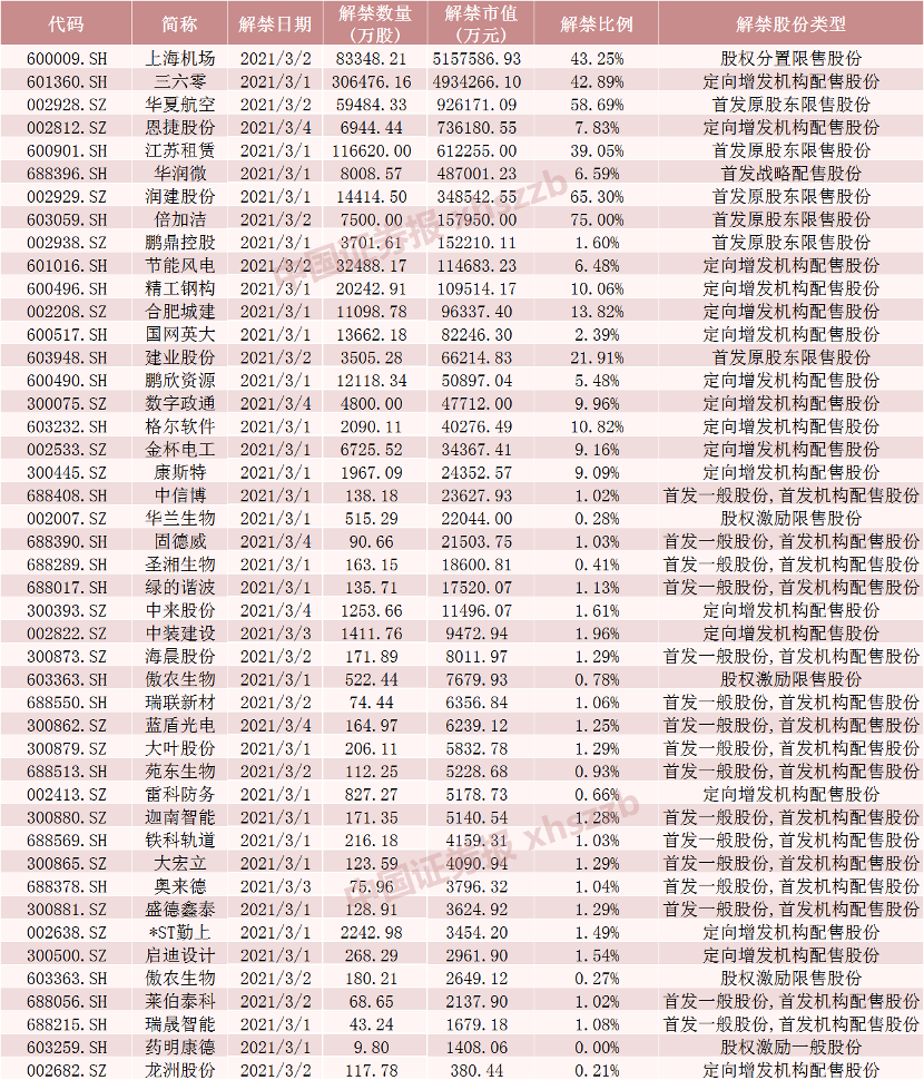 具体来看,Wind数据显示,上海机场3月2日将解禁8.33亿股,均为股权分置限售股份。三六零3月1日将解禁30.65亿股,均为定向增发机构配售股份。华夏航空3月2日将解禁5.95亿股,均为首发原股东限售股份。恩捷股份3月4日将解禁6944.44万股,均为定向增发机构配售股份。江苏租赁3月1日将解禁11.66亿股,均为首发原股东限售股份。