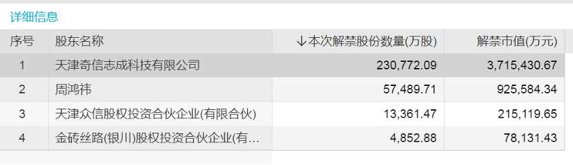 三六零解禁详细信息